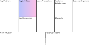 BMC Key Activities Bild Posted on9. Dezember 20259. Dezember 2025AuthorBenno Jung Schematische Darstellung des Business Model Canvas. Der zentrale Baustein „Key Activities“ ist farblich markiert und hebt sich von den anderen acht Blöcken des Modells ab.