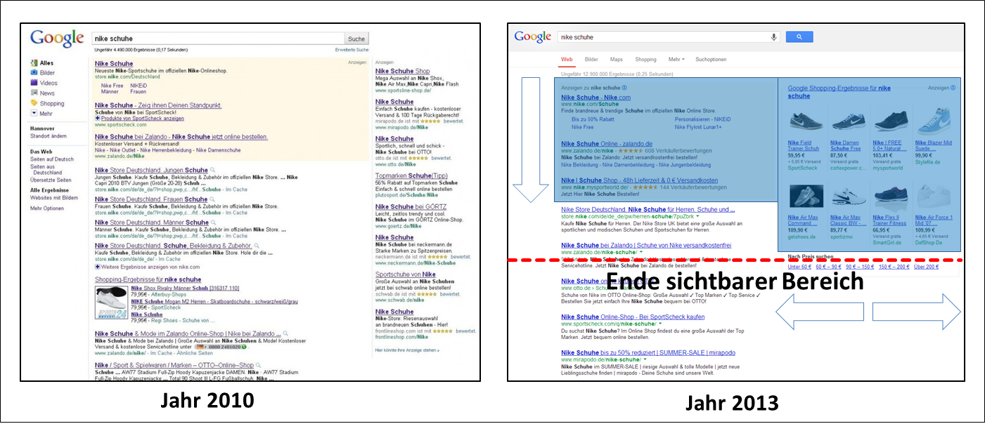 Aufgrund der stetigen Erweiterung der Werbeanzeige mit Zusatzinformationen wird der obere bezahlte Bereich größer und schiebt somit die klassischen zehn Suchergebnisse nach unten in den nicht mehr sichtbaren Bereich. Eine weitere Veränderung der Suchergebnisseite, die mit der Einführung von Anzeigen mit Produktinformationen einherging, ist die optische Verbreiterung der seitlichen Spalte mit den AdWords Anzeigen. Dies soll ein Vergleich der Suchergebnisseite aus dem Jahr 2010 mit der aus dem Jahr 2013 aufzeigen.