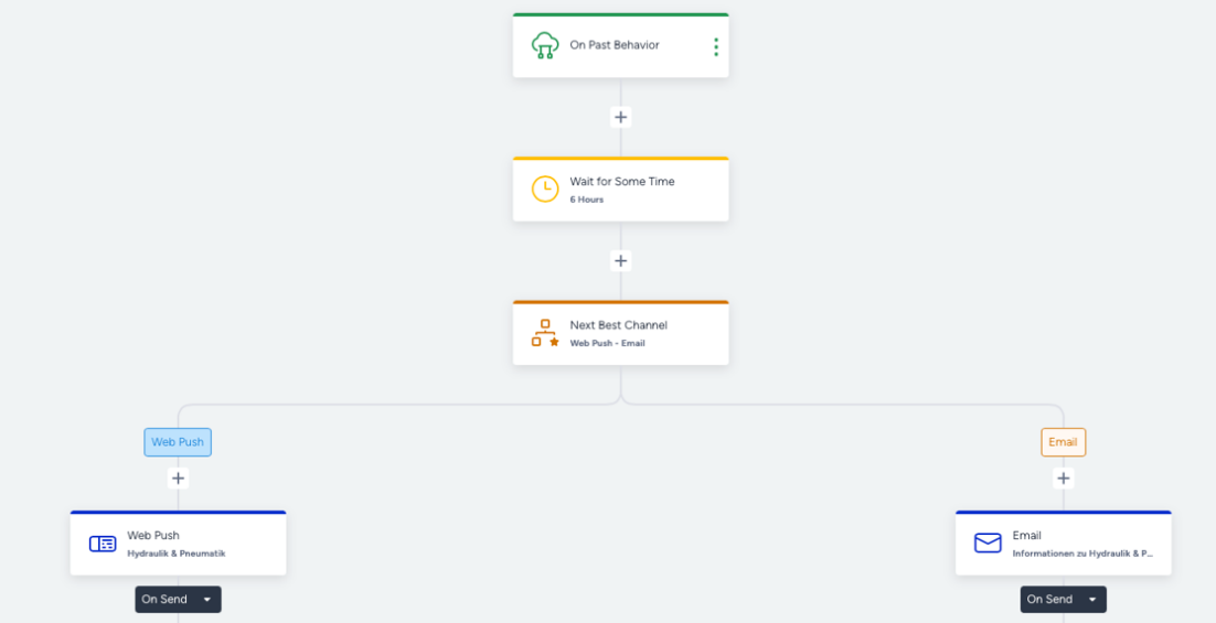 Die Zeiträume wurden dabei gewusst gewählt, da dem Außendienst wichtig war, dass der User nicht von einer Interaktionsflut überfordert ist. Durch die Kombination aus zeitlich versetzter E-Mail-Kommunikation, Web-Push-Nachrichten und klar definierten Wartezeiten