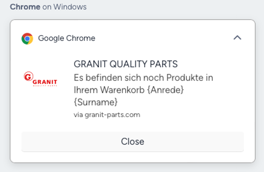 einer Conversion zu vermeiden. Bei einer Add-to-Cart-Aktion wird ohne zusätzliche Wartezeit eine Web-Push-Nachricht ausgespielt, die den Kunden erneut auf die Produkte im Warenkorb aufmerksam macht.