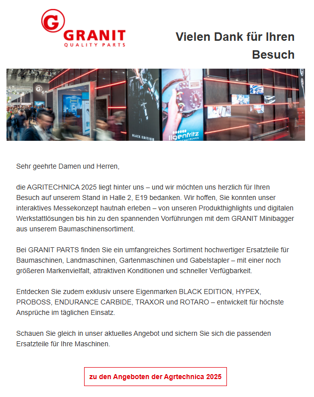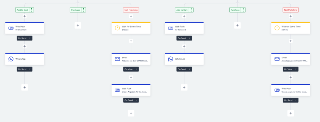 Anschließend wird geprüft, ob der Nutzer mit der E-Mail interagiert und sich diese ansieht. Wenn dies der Fall ist bekommt der Nutzer einen WebPush der ihn zu den Angeboten der jeweiligen Messe führt. Wird dieser auch gesehen, bekommt der User eine weitere E-Mail in der noch einmal auf die verfügbare Produktpalette von GRANIT QUALITY PARTS aufmerksam gemacht wird und in den Shop geführt wird. Wird diese wieder angesehen, vergehen noch einmal zwei Wochen bis der User einen WebPush mit den Angeboten der Messe bekommt.