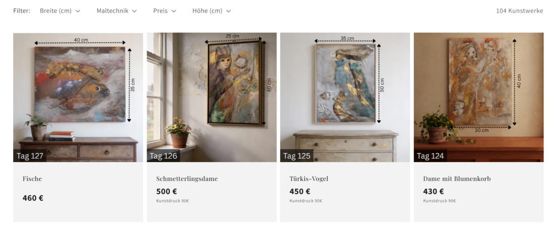 Für die inhaltliche Struktur des Shops wurden die Gemälde in verschiedene Kategorien eingeordnet, um Nutzern eine bessere Orientierung zu ermöglichen. Zusätzlich pflegten wir zu jedem Werk detaillierte Informationen ein, darunter die verwendete Maltechnik, die Maße der Leinwand sowie der jeweilige Preis. Auf dieser Basis implementierten wir Filterfunktionen, mit denen Besucher gezielt nach bestimmten Merkmalen suchen und die Auswahl eingrenzen können.