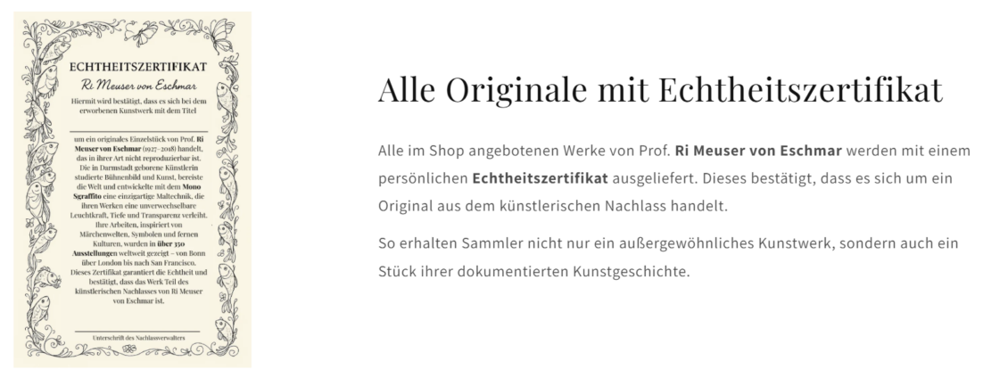 Da es sich bei den angebotenen Werken um historische Einzelstücke handelt, war der Aufbau von Vertrauen ein zentraler Bestandteil der Shop-Konzeption. Aus diesem Grund entschieden wir uns, jedem Originalgemälde ein Echtheitszertifikat beizulegen. Dieses Zertifikat dient als Nachweis der Authentizität, unterstreicht den künstlerischen Wert der Werke und stärkt die Glaubwürdigkeit des gesamten Angebots.