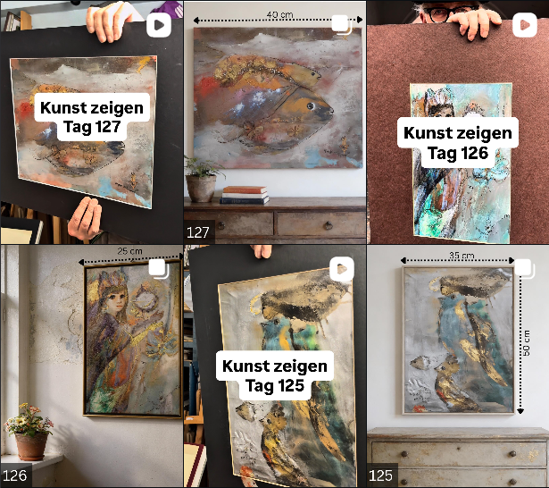 Parallel zur Shop-Umsetzung bauten wir eine Social-Media-Präsenz auf Facebook, Instagram und TikTok auf, obwohl dies nicht Teil der formalen Projektanforderungen war. Ziel war es für uns, frühzeitig Reichweite aufzubauen und den Shop mit begleitendem Content zu unterstützen. Als inhaltliche Grundlage stellte uns Tommy längere Videos zur Verfügung, bei denen er die Gemälde zeigte. Diese Videos wurden von uns in einzelne kurze Clips aufgeteilt, sodass pro Tag jeweils ein Video zu einem konkreten Gemälde veröffentlicht werden konnte.
