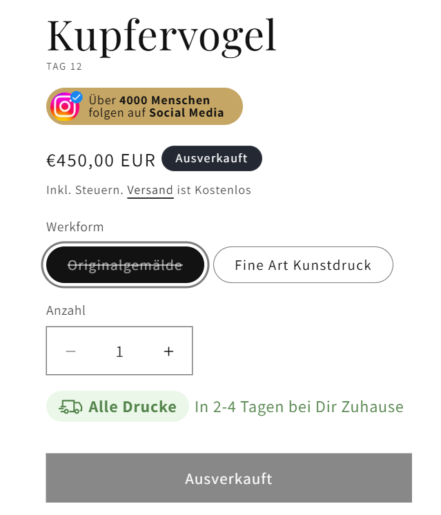 Wurde ein Originalgemälde verkauft, markierten wir dieses entsprechend im Shop als nicht mehr verfügbar. Es wurde jedoch bewusst nicht vollständig aus dem Sortiment entfernt, da weiterhin die Möglichkeit bestehen sollte, einen Kunstdruck des jeweiligen Motivs zu erwerben. So blieb das Werk sichtbar und weiterhin Teil des Gesamtangebots, während gleichzeitig die Exklusivität des Originals gewahrt wurde.