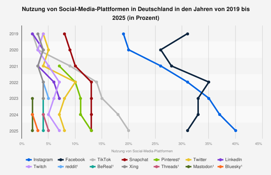 • Instagram steigt stark an und liegt 2025 bei rund 40 %