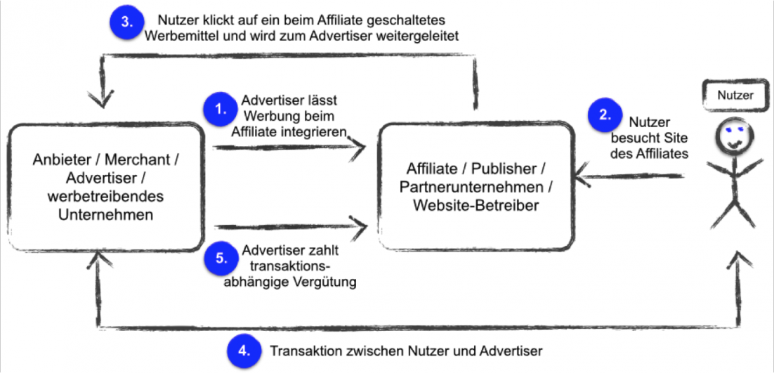 Hauptakteure im Affiliate Marketing sind werbetreibende Unternehmen – auch Advertiser oder Merchant genannt – und Affiliate Partner, die Werbemittel des Advertisers auf ihrer Seite integrieren. Affiliate Partner werden auch Publisher genannt. Wie die Abbildung 1 zeigt, muss der Advertiser – z. B. OTTO – zunächst Werbemittel zur Verfügung stellen, die der Publisher – z. B. ein Blog-Betreiber – auf seiner Webseite einbinden kann (Schritt 1). Im zweiten Schritt liest sich ein Nutzer einen Blogbeitrag des Publishers durch und klickt auf eine Werbeanzeige. Der Nutzer wird dann auf die Seite des Advertisers weitergeleitet (Schritt 3). Im Optimalfall findet anschließend eine Transaktion zwischen Nutzer und Advertiser statt (Schritt 4). In diesem Fall hat die Werbeanzeige des Publishers zum Kauf beigetragen und wird entsprechend vom Advertiser vergütet (Schritt 5).[1] In dieser vereinfachten Darstellung finden Affiliate-Netzwerke keine Berücksichtigung. Diese sind aber von besonderer Bedeutung, da viele große Unternehmen – so auch OTTO – mit einem oder mehreren Netzwerkbetreibern kooperieren. Ein solches Netzwerk ist von Vorteil, da es neben den technischen Grundvoraussetzungen auch Zugang zu einer großen Zahl an Publishern ermöglicht und juristisch geprüfte Verträge zur Verfügung stellt.[2]